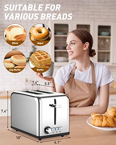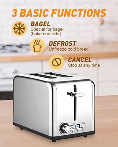【Efficient Design】: Reheat and cancel buttons for simple, convenient operation. Auto-centering guides for even toasting. Auto-jam and auto-shut off for added security. Specially designed to easily fit any kitchen countertop! Its elegant and durable brushed stainless-steel finish is sure to brighten up any kitchen!