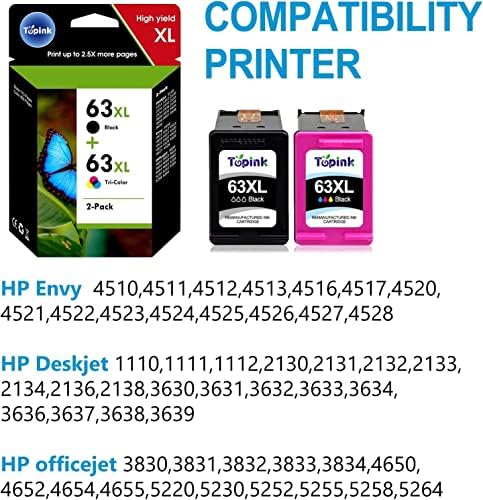 🏀【63 Ink Cartridges for HP Printers Printer Compatibility】100% compatible with Envy 4510 4511 4512 4513 4516 4517 4520 4521 4522 4523 4524 4525 4526 4527 4528 ; DeskJet 1110 1111 1112 2130 2131 2132 2133 2134 2136 2138 3630 3631 3632 3633 3634 3636 3637 3638 3639 ; OfficeJet 3830 3831 3832 3833 3834 4650 4652 4654 4655 5220 5230 5252 5255 5258 5264 Printer