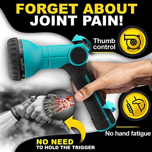 The full powerful control is under your thumb we carefully designed the thumb control of our garden hose spray nozzle so that you can change the water flow with just one finger. Forget about getting tired from using a sprinkler nozzle with a trigger where you have to hold it for the whole watering process. There is no more tiredness or joint pain after usage.