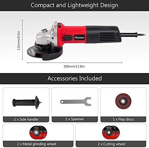 Package Included – Please pay attention to safety protection before proceeding. An Handheld Grinder, 2 x Metal grinding wheels, 2 x Cutting wheels, 1 x Side handle, 1 x Spanner, 1 x Flap discs, user manual and US based customer service.
