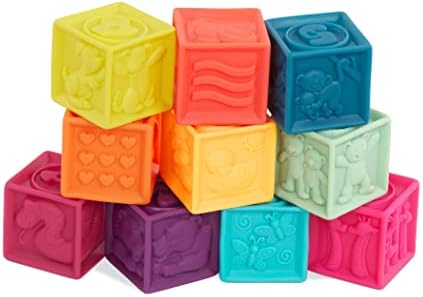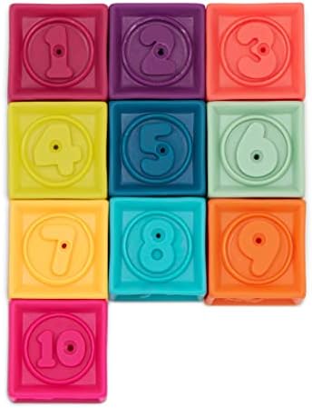 Stack, squeeze, chew, and play the days away with the One Two Squeeze building blocks from B. toys! These soft and colorful blocks come with hours of fun and many learning opportunities for your baby or toddler. Not only will they love stacking them up and knocking them back down (this is the best part!), they’ll also get to discover different animals, look at vibrant colors, and learn numbers 1 to 10 by exploring each side. Every textured block is hand-sculpted and made of worry-free materials. Ten blocks and 60 sides of sensory fun!
