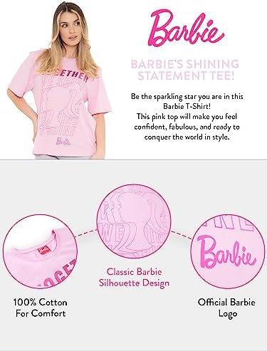 Shine in Style With This Barbie T-shirt: Embrace Barbies spirit with this vibrant pink Barbie t-shirt. Showcasing a unique print of the iconic Barbie silhouette with ‘Together We Shine’ printed in the background, this Barbie top is the perfect addition to any women’s clothes collection