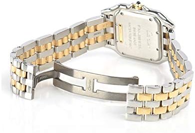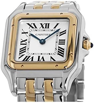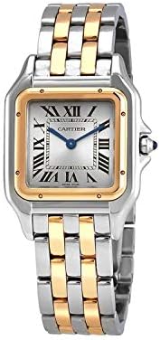 Silver dial enhanced by blued-steel sword-shaped hands. Silver-tone stainless steel case with a two-tone (silver-tone and gold-tone) stainless steel and 18kt yellow gold band. Quartz movement. 30 meters / 100 feet water resistance. Fixed bezel. Scratch Resistant Sapphire crystal. Solid caseback. Hidden Fold Over clasp. Pull / Push crown. Case size 29 mm x 37 mm x 6 mm. Cartier W2PN0007 Panthere Watch.