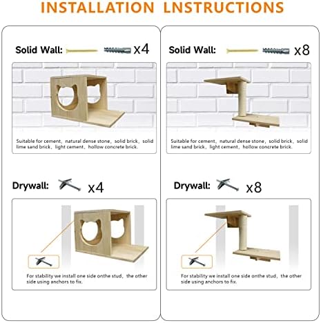 [Easy to Install] The cat shelves set comes with screws and instruction. Only need an electric drill will easily get down the whole set assembled! PLEASE NOTE DRYWALL REQUIRES SPECIAL DRYWALL EXPANSION SCREWS WHICH ARE INCLUDED.