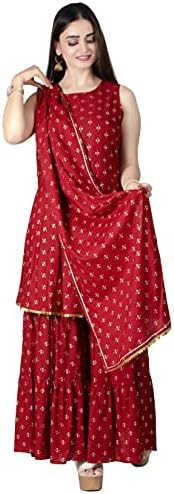 Add grace and charm on your appearance in this maroon colored casual block print rayon kurti sharara set. This set fabric is lightweight and assures the wearer a perfect fit & comfort.