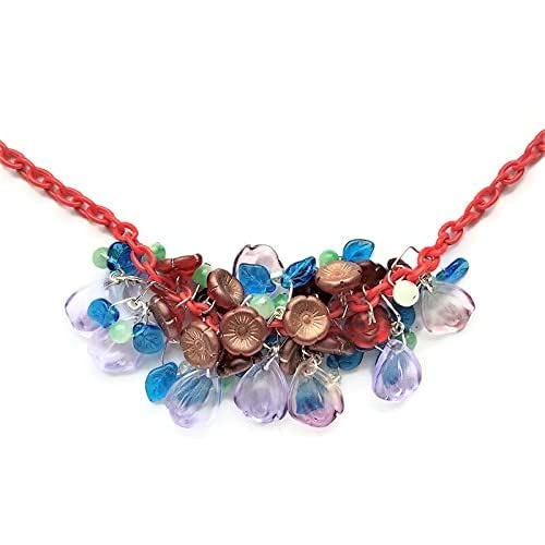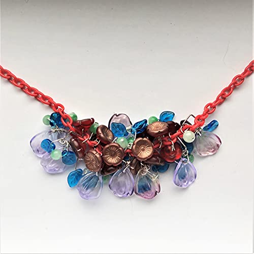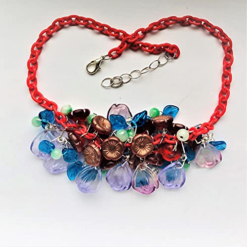 I made this lovely Bakelite style necklace using colorful beads: vintage Czech floral beads, blue leaves, light green gemstone beads and lilac rose petals put together in a pretty design. All the beads are glass or gemstones, some are vintage. Light acrylic red chain (16″ plus extension). This pretty necklace will cheer up any outfit. Great natural colors are very much in style for spring, summer and fall. Very light and comfortable to wear. Stunning!