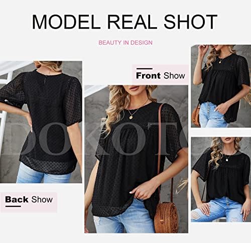 Dokotoo Womens Crewneck Lace Crochet Pom Pom Flowy Short Sleeve Casual Shirts Blouses Tops