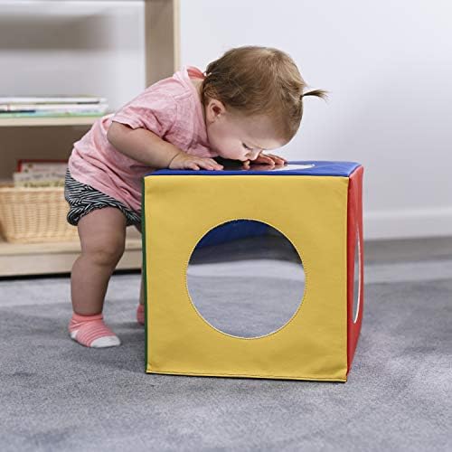 Peek-a-boo, I see me! Infants and babies will love playing and learning with the SoftZone Mirror Cube. Designed for everyday use in daycares, preschools, and early childhood learning environments and perfect for home, this sensory foam cube is made for tummy time or sit-and-play. Constructed with child-safe mirrors, this soft sensory toy encourages self-discovery as infants explore bodies, facial expressions, and gestures while encouraging communication and social skills. Babies have fun with sensory mirrors and enjoy watching themselves as they discover their own reflection through movement and develop self-awareness. As children grow, the lightweight cube is fun for toddlers to push and maneuver and encourages important gross motor development. The bright colors aid in early color recognition and cognitive skills. Mirrors add depth and dimension to playtime and are a great way to capture children’s attention and spark imagination and creativity. The dense foam core is covered in soft vegan leather with a non-slip side for added stability during play; adult supervision is required. Create a cozy sensory play space by pairing the soft foam block with ECR4Kids SoftZone Activity Mats to create a baby activity center; sold separately.