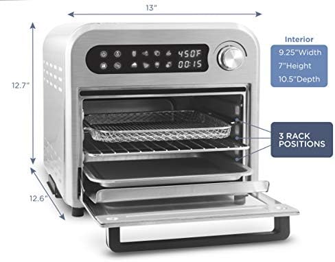 The Elite Gourmet Infinite-Use Programmable Air Fryer Oven has a variety of functions to achieve a wide array of cooking tasks. With its easy to use Adjustable 60-minute Timer and Temperature controls, you can fry, cook, bake, broil and roast your favorite meals and snacks with ease! Not only can you cook foods without the mess of greasy oil, but you can cook faster which saves you time and energy, no Preheating is necessary. Unlike most conventional toaster ovens, the Air Fryer Oven uses a unique vapor system combined with circulating hot air will automatically make your foods crispier, tastier and juicier and most of all healthier without the unnecessary fat and oil. Its extra-large 10-quart capacity and mesh basket gives you the ability to cook for a large hungry crowd all at once. No need to reheat soggy leftovers by using the microwave! Clean up is also cinch, all removable racks and pans are dishwasher safe! Included with your purchase is also our full color recipe booklet for appetizers, entrees and desserts!