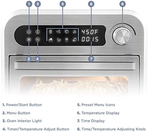 PRE-PROGRAMMED MENU FUNCTIONS lets you select easy-to-use cooking times and temperatures for certain foods. It includes French Fries, Fish, Steak, Chicken, Pizza, Bread, Cake, Vegetables, Keep Warm and Dehydrate. The oven also comes with a full-color booklet featuring 26 delicious and healthy recipes to get you started.