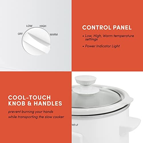 The Elite Gourmet 1.5Qt. Mini Slow Cooker is perfect for cooking and serving small one-pot meals and appetizers such as soups, stews, meatballs, dippings, and sauces. It’s a great kickoff for a fondue party or where everyone prepares their favorite dip in their 1.5Qt. Mini Slow Cooker. This versatile little appliance can be a single person’s best companion as well the all-star at your next Superbowl party. It features low and high temperature settings, a keep-warm setting allowing you to keep your meal hot and fresh before it’s served and an attractive white finish. It includes a removable inner stoneware pot that’s easy to clean, a tempered glass lid with metal rim for easy viewing of cooking cycle and cool-touch handles and knob for safe handling.
