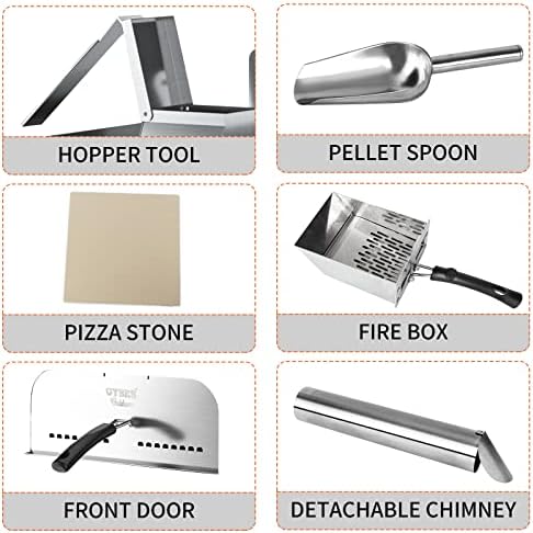 Packages include: 1 X 12” Cooking Pizza Oven Grill 1 X Removable Door with Handle 1 X Pizza Stone 1 X Pellet Scoop 1 X Fire Box 1 X Hopper Tool