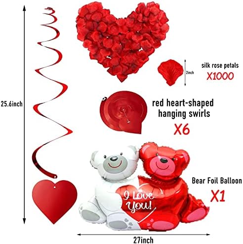 I Love You Red Balloons and Heart Balloons Kit with 1000Pcs Dark-Red Silk Rose Petals Romantic Flower Decoration Love-Bear Red Heart Balloons for for Valentine’s Day Wedding Birthday Party Decorations