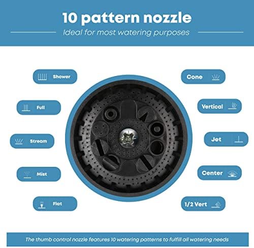 10 WATERING PATTERNS: Whether you need a high-pressure jet to clean a hard surface or a soft delicate shower to water the garden, this nozzle has you covered. It has spray pattern options for every watering need, including fan, mist, soaker, jet, and you can change the pattern easily with a twist of the head disk.