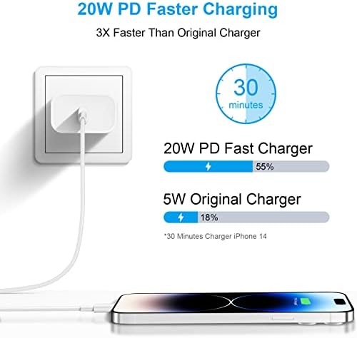 The perfect combination of 20W USB-C wall charger and 6ft USB-C to lighting cable allows charge your iPhone 14/13/12 ( iPhone 8 or later) to 55% in half an hour, 3x faster than regular charging.