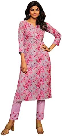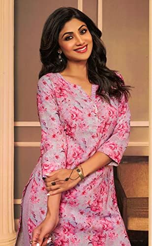 Contains 2 Pcs set (Kurta with Pant) Ready to Wear ..Kurta / Top Length 46 inches; Bottoms Length- 35-36 inches….Kurta is made from elegant cotton linen fabric with allover floral prints and show buttons at the neckline. ..Bottom is plain cotton with embroidery at bottom…|Size Chart Guide|: Refer the last product image for Size Chart…