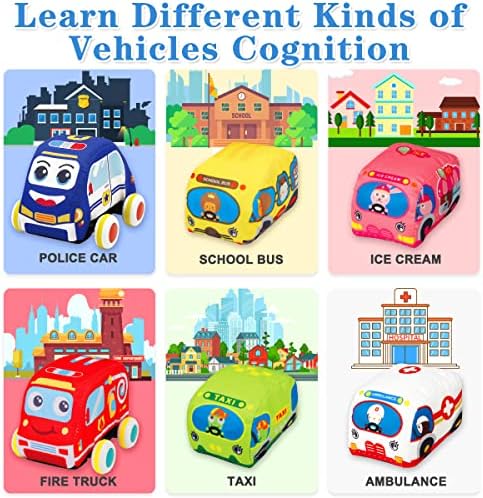 Child-safe Design for Baby: This soft car toys set for 1 year old boy is made of soft fabric and stuffing sponge. 100% safe and environmentally friendly, 100% screen free, BPA free, non-toxic materials, no small parts; Washable but soft. Perfect for early learning toys for babies and toddlers
