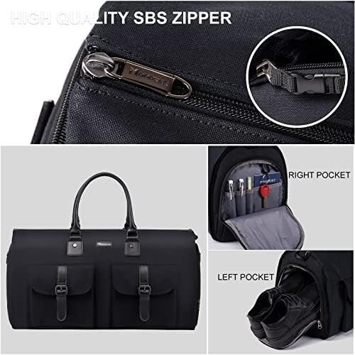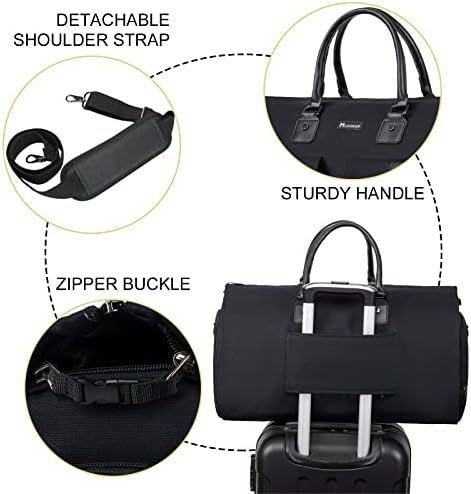 Durability and Water Resistance: Crafted with high-quality canvas fabric, this garment bag is scratch-resistant, tear-resistant, and water-resistant. And with adjustable shoulder strap and trolley sleeve, the garment duffel bag has three ways to carry – hand bag, shoulder bag and trolley duffel bag.