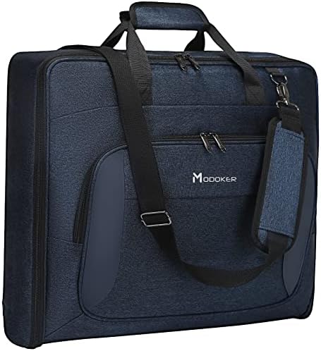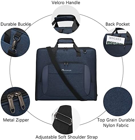 WINKLE FREE GARMENT BAG: Modoker Bi-Fold Garment Bag is special designed to keep clothes wrinkle-free, the interior buckle is intended to secure the clothes from creasing. No Wrinkles Trouble Your Dress or Suits Any More. You can also use the bag as a hanging garment bags to protect clothes from dust by hanging them inside with their hangers and then in the closet bar