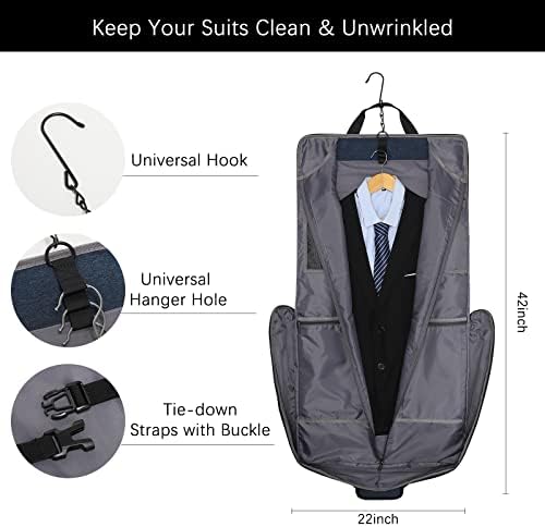 CARRY ON GARMENT BAG: Garment Bag Dimension: 42”L x 22”W, Garment Suitcase Dimension: 22”L x 21.6”W x 3.9”H; Weight: 2.4lb. This soft- sided garment bag meet the require of sizer at the airport (Length + Width + Height: up to 51 inches / 130 cm). Thus, this Traveling Garment Bag can be taken as your carry on luggage partner
