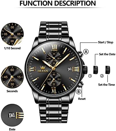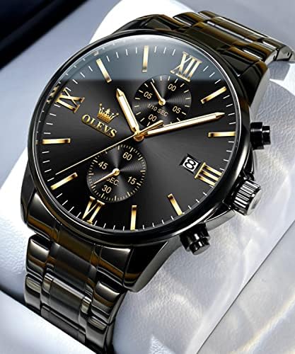 [Mens Black Watches]⌚ A reinvention of the classic watch,the OLEVS is the ultimate fashioner’s timepiece.The mens watches comprise of 41mm case with high hardness coated glass mirror,round black dial with date and chronograph display,it’s a favorable purchase.This dress watches for men is also silent and won’t annoy you with an incessant ticking.