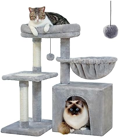 Activity Center: This small cat tree is suitable for multiple cats to play together. The big&soft cat condo provides your kitten a private house to have a rest while the deep cat hammock will be its favorite place to curl up. Not only that, your cats will have a bird view and look outside on the top perch.