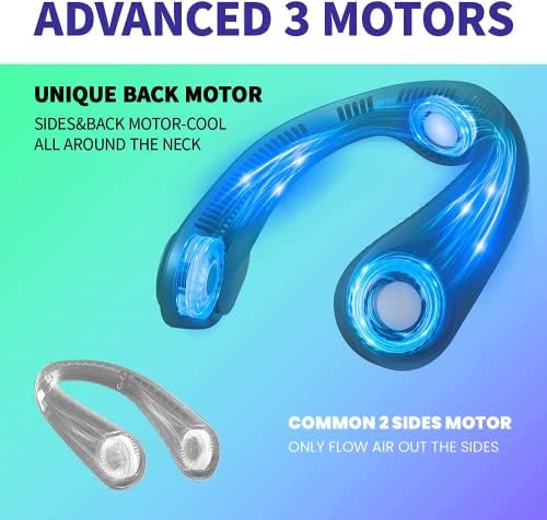 3 speeds adjustable fan.360° cooling experience and this one keeps cool without blowing straight into eyes and drying them out.4000 mAh Battery with 3-10 running hours.The 3rd motor makes sure the back of the neck enjoys all the cooling.The neck fan has 79 ventilation holes that keep the face cool and can keep the makeup. It can be used safely by children and adults.Wider outlets with higher airflow.Headphone design, sleek appearance.