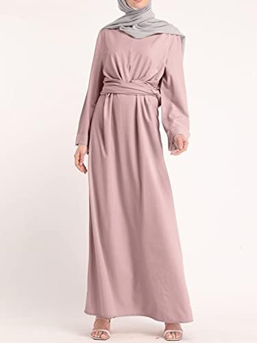 Womens Abaya Muslim dress long sleeve self-tie knot high waist solid color maxi dress for church pray