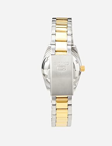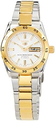 White dial. Silver-tone stainless steel case with a two-tone (silver-tone and yellow gold-tone) stainless steel band. Automatic movement. 50 meters / 165 feet water resistance. Fixed bezel. Fold Over with Push Button Release clasp. Case size 25.9 mm x 10 mm. Seiko SYMG42K1 Seiko 5 Watch.