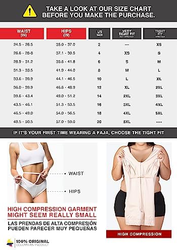 CHECK OUR SIZE CHART (IMAGE 3) BEFORE THE PURCHASE: Fajas’ sizes are different from your regular clothes, this is why it’s so important to measure your waist and hips to find your size. Hips measures: XS (30-31″) S (32-34″) M (35-37″) L (38-49″) XL (40-41″) 2XL (42-45″) 3XL (46-47″) It will seem smaller than what it really is, STRETCH IT! And it will surely fit. We have great videos with NOT SO OBVIOUS TIPS on how to put it on (visit our Store to find them) Stage X