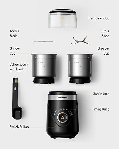 【What You Get】You will get a coffee grinder, a 2-blade cup, a 4-blade cup, a 2-in-1 coffee spoon with brush, a user manual, the 2-year warranty and our friendly customer service.