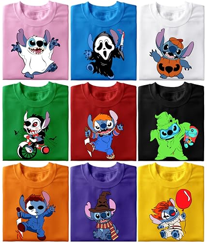 Unique Blend of Cuteness and Spookiness: Experience the best of both worlds with Stitch’s charming presence combined with eerie Halloween elements. The shirt’s expertly crafted designs capture Stitch celebrating the season, donning famous horror movie killers’ costumes, making it a must-have for any Halloween party lover.