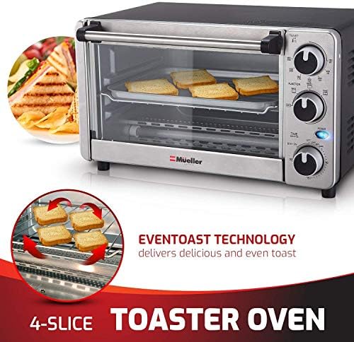 Toaster Oven 4 Slice, Multi-function Stainless Steel Finish with Timer – Toast – Bake – Broil Settings, Natural Convection – 1100 Watts of Power, Includes Baking Pan and Rack by Mueller Austria