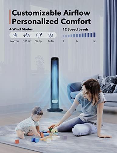 Personalized Comfort: The bladeless tower fan is designed with 4 wind modes including Normal Mode (runs at selected speed; 12 speed levels), Sleep Mode (fan speed reduced by 2 levels every 30min; 3 speed levels), Natural Mode (fan speed fluctuates to mimic natural wind; 3 speed levels), and Auto Mode (fan speed changes as ambient temperature varies; 12 speed levels), offering 30 cooling options to meet all your needs