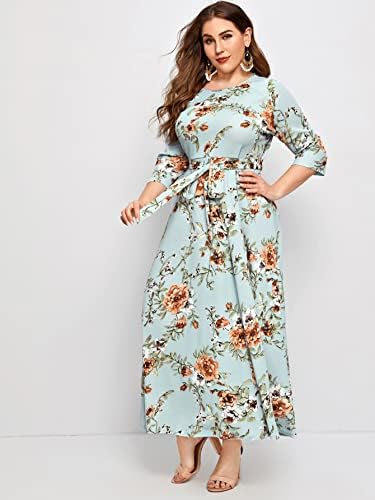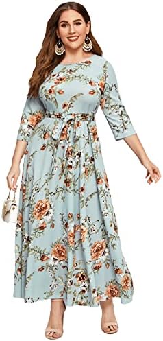 Features: plus size, floral print, round neck, 3/4 sleeve, boho, belt, maxi, a line.