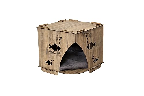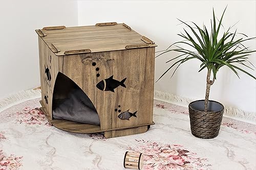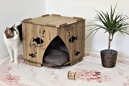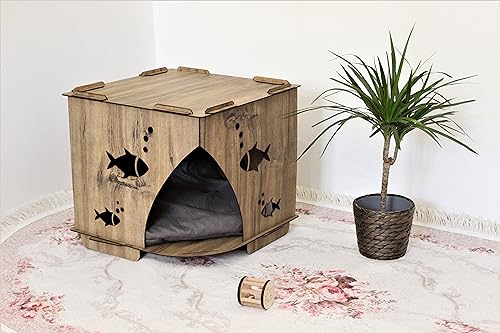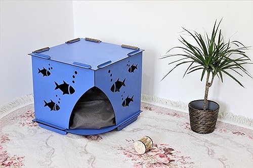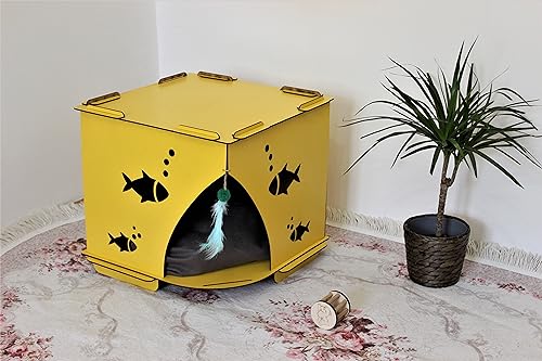Item details Handmade Materials 4 mm quality plywood Dimensions Width: 40 cm – 15,71″ Height: 40 cm – 15,71″ Depth: 40 cm – 15,71″ .This house is specially produced for cats with laser cutting of 4 mm plywood material. .. The color of the cushion shipped with the cat house may differ from the picture. .. The cushion is made of soft sponge specially for cat house. .. You can use the cat house anywhere you want without touching the water. * EASY AND ENTERTAINMENT INSTALLATION; * Our product is shipped unassembled. * You won’t need any screws or tools * The product, which is installed by clamping in a certain order, becomes a solid structure where all parts support each other when the last piece is mounted. * Does not contain polyester mixture. * The materials used in its production allow you to clean it with a slightly damp detergent cloth. * It is harmless to you and your pet’s health while using it and is harmless to nature when it completes its life. Your cat will be very happy in this house If you buy 2 pieces and want different colors, it will be enough to let us know. Please feel free to message me for any questions.